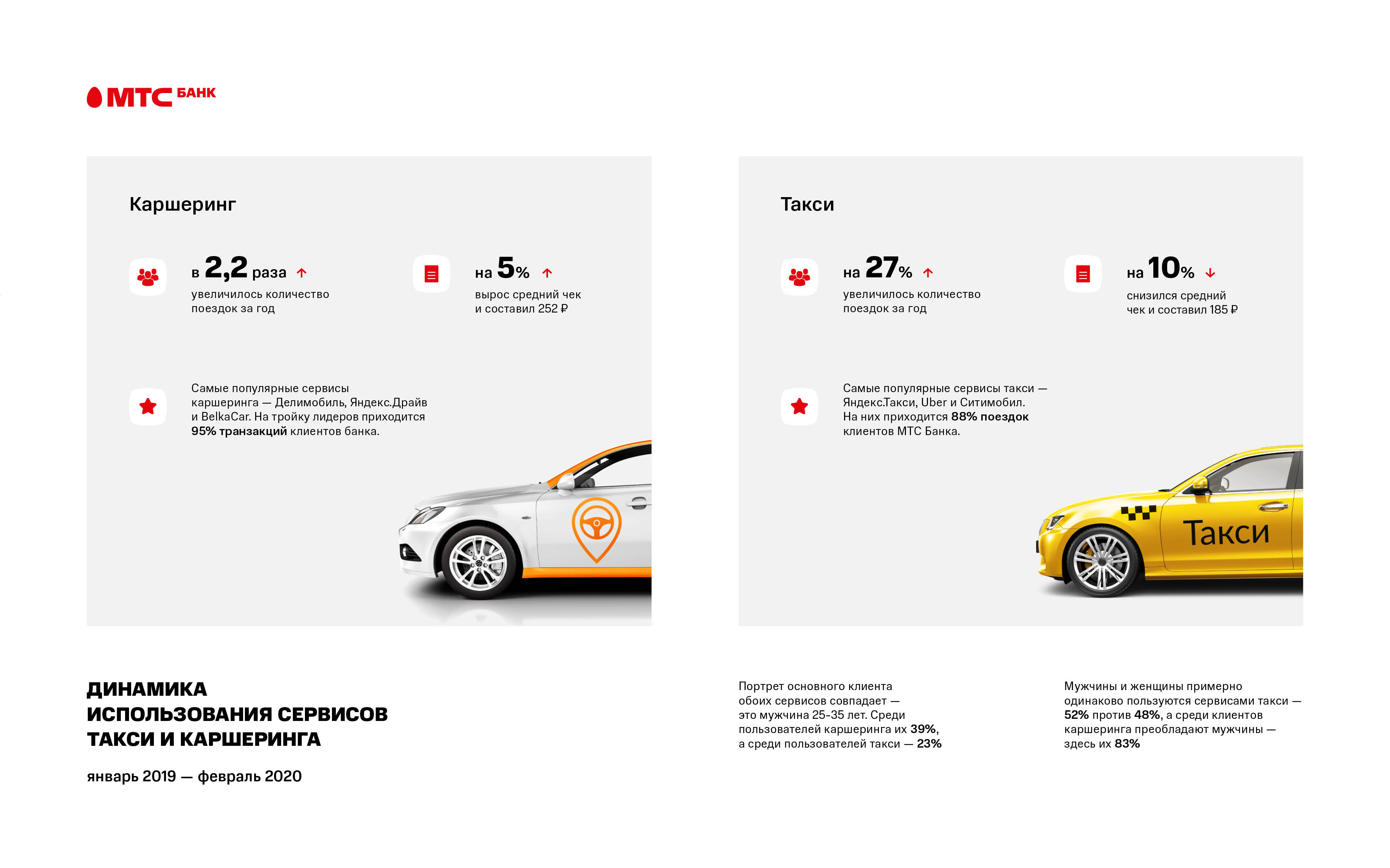 К Международному дню таксиста (22 марта) МТС Банк изучил динамику предпочтений россиян при использовании сервисов такси и каршеринга. Анализ собственных данных за январь-февраль 2019 и 2020 годов показал, что количество поездок на каршеринге за год увеличилось в 2,2 раза, на такси – на 27%.